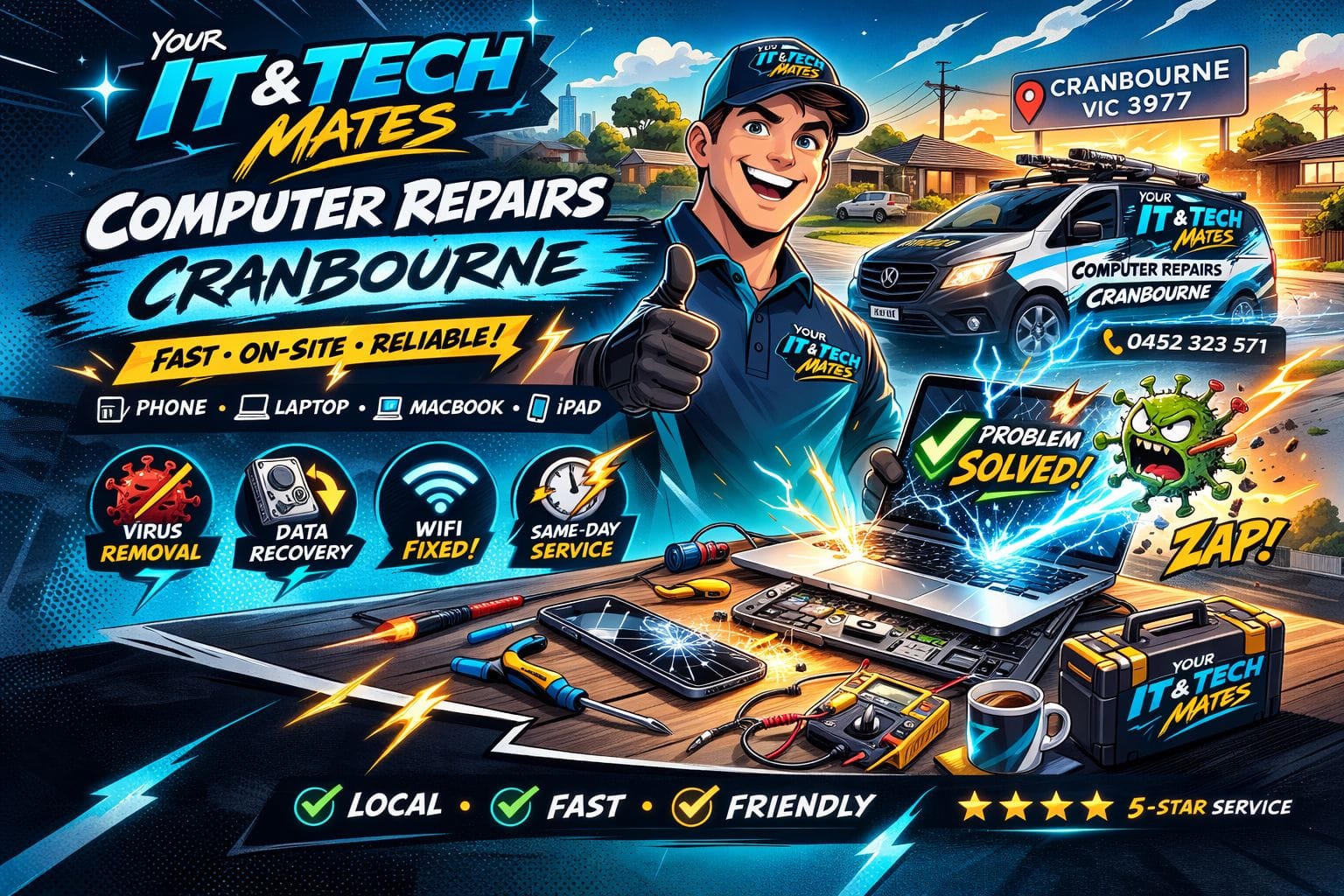 Providing reliable mobile tech support across Cranbourne and surrounding suburbs. From emergency laptop fixes to onsite computer repairs, we are your trusted local tech experts.